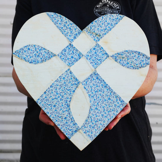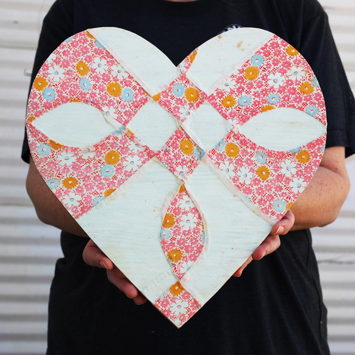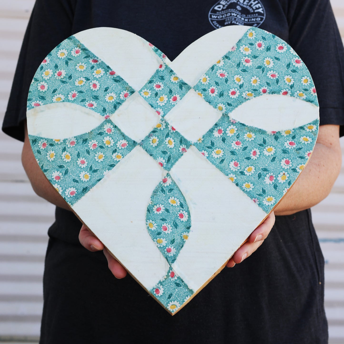 We’ve brought new life to a beautiful handmade Texas quilt—crafted over 100 years ago—by carefully repurposing it into one-of-a-kind wall-hanging hearts. Each heart is made from reclaimed pallet wood and lovingly adorned with your choice of quilt pattern, making every piece truly unique.